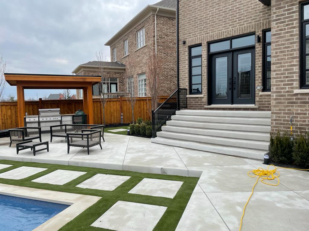 The backyard transformation centers around a custom 13′ x 28′ inground pool installed by Mayascapes Pools, featuring a luxurious tanning ledge and custom steps. Our professional hardscaping includes over 1,600 sq. ft. of modern concrete patios and stepping stones, finished with white colour hardener for a bright, sophisticated appearance. The design incorporates 800 sq. ft. of artificial turf, almost 100 ft of natural stone pool coping in elegant ivory, and modern concrete bullnose steps leading to the home.